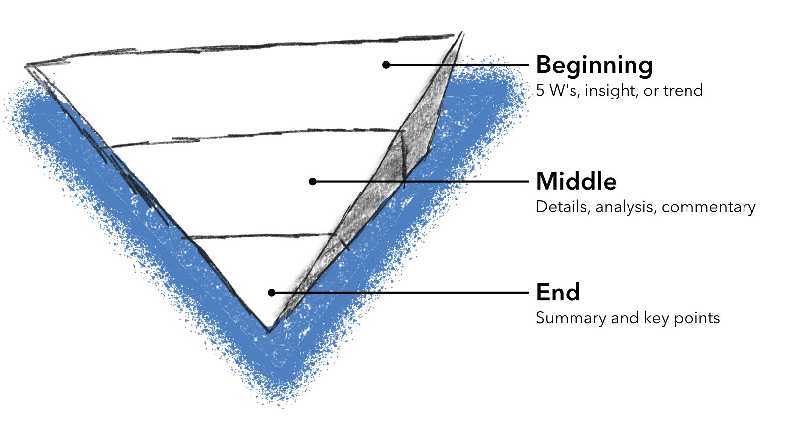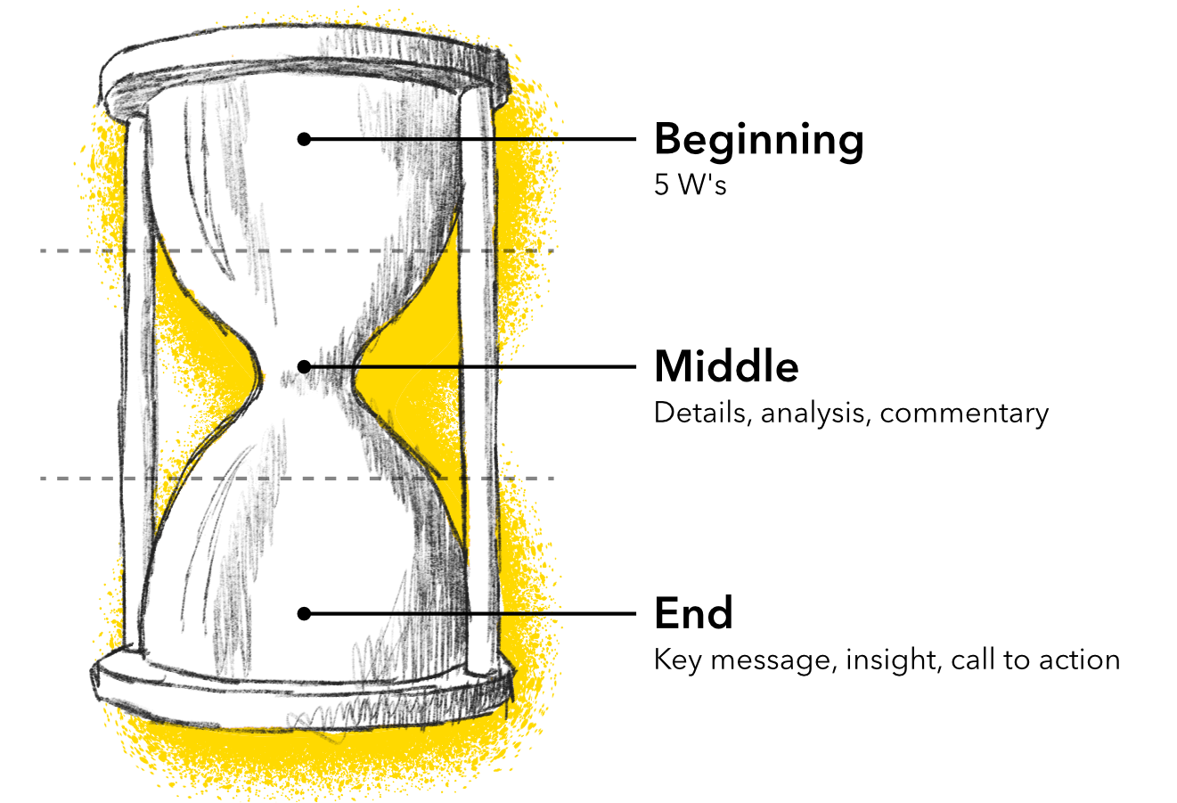 The hourglass structure combines the narrative immediacy of the inverted pyramid with the increasing depth of the pyramid structure. In contrast to the diamond structure, the hourglass sandwiches examples or context between the story’s main insights or takeaways.