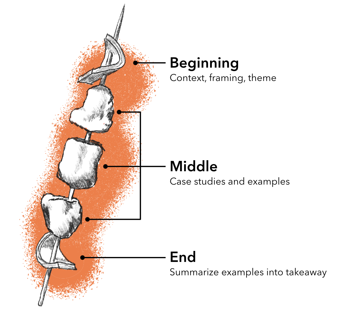 - End: Returns to initial example, and ties it back to the story’s overarching theme or message.