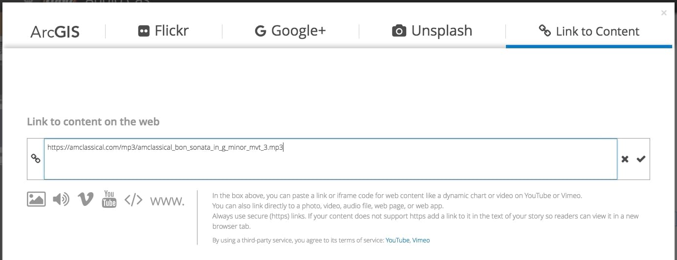 If there’s an audio file hosted on a web server you can simply paste the link to the file in the Link to Content tab of the media picker. Be sure to use an HTTPS link to ensure the audio clip will play for all your readers. When linking to an audio file, the same player shown above for uploaded audio files will appear in the story.