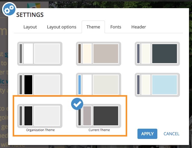 To update your story to use your organization’s latest shared theme, choose Organization Theme, apply the changes, and save your story. If you apply a different theme to your story and save it, the Current Theme will remain available only for that builder session; it will not be available next time you load builder.