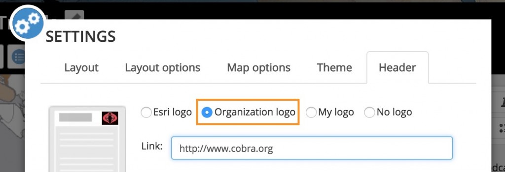 To apply the shared theme to a story you have already created, go to Settings and choose to use your organization’s logo. It’s also recommended to configure a link to your organization’s home page so that readers will be directed there if they click on the logo in your story.