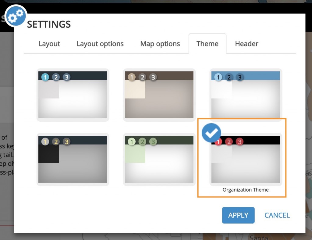 Then, if your story is a Map Series or Map Journal, you can go to Settings > Theme and select the Organization Theme to apply the theme colors.