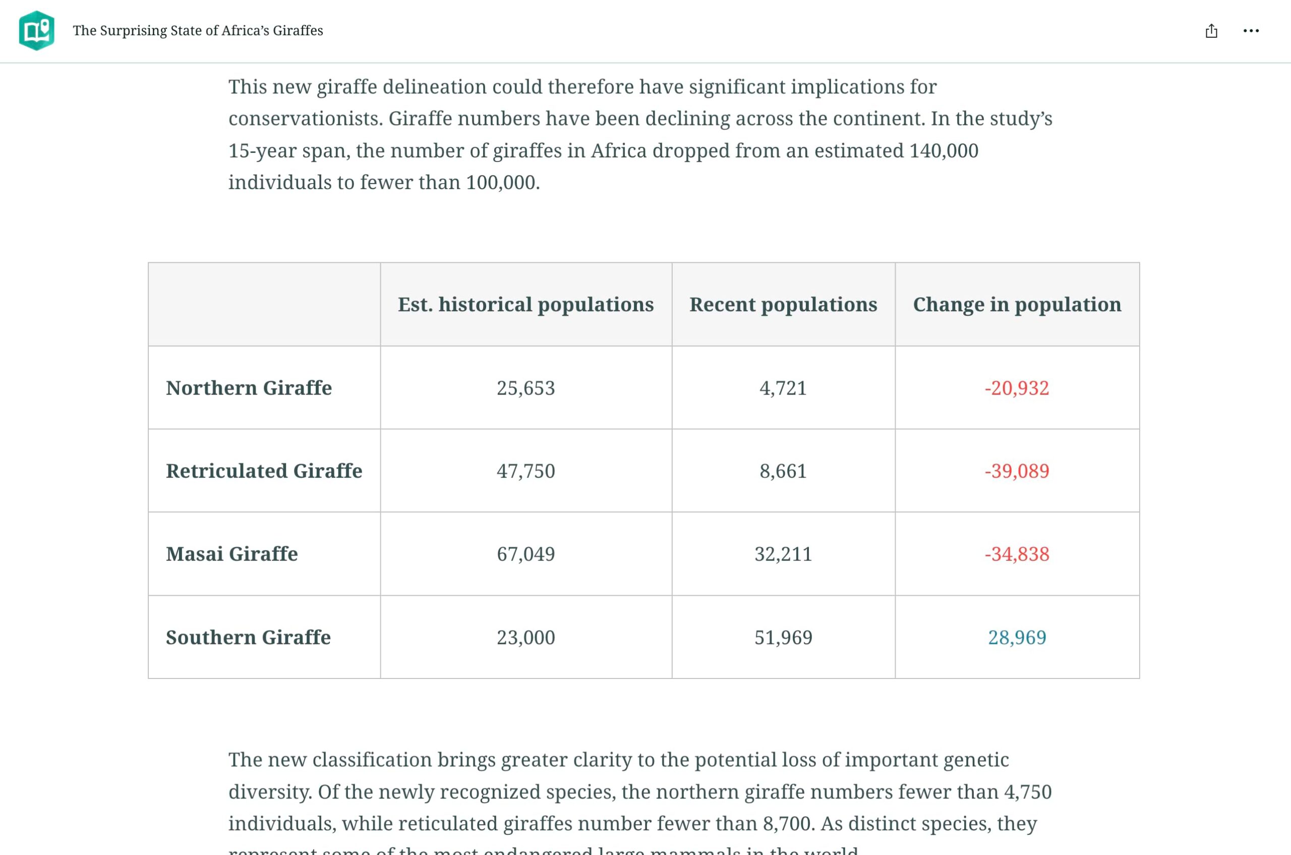 Tables were added to ArcGIS StoryMaps a few months ago. Since then they have gained the ability to align text, and undo support has been added to all table actions, so it’s easy to rollback any mistakes or changes you don’t want to keep. We’ve seen many great examples of tables created by the storytelling community. The one shown below is from The Surprising State of Africa’s Giraffes (arcgis.com), published by our very own StoryMaps team, and you can see how it utilizes the new alignment option to center the information in some of the cells.