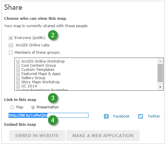 Presentations can also be embedded in web pages or used inside some Story Maps. Follow these these steps to include a presentation in a Story Map Journal.