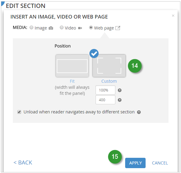 14. For best results choose Custom from the Position options. Use 100% for the width (to fill the Side Panel width) and choose an appropriate height.