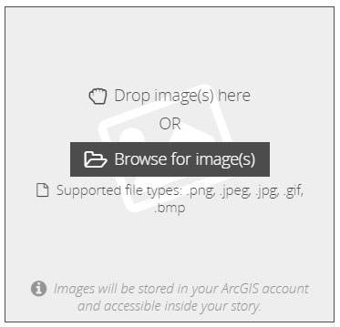 To add local images, drag and drop them onto the box, or click Browse for image(s) to locate and add them. Images are automatically optimized and stored with your Story Map Cascade. No special privileges are needed, and this option also works for public account users.