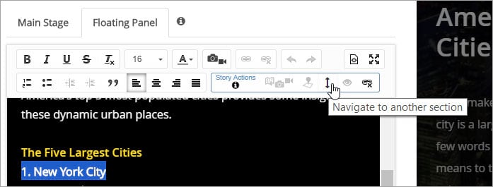 Story actions are links you can add to your narrative within your story map to design how readers experience your story. For example, if your story mentions Chicago you can make the word “Chicago” a link that will zoom the map to Chicago, or change the Main Stage content to display a photo of the city.