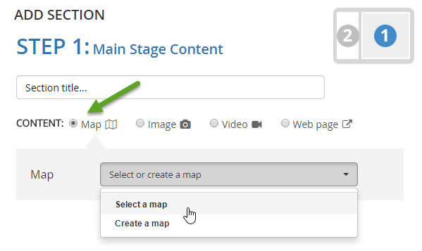 Using the Map Journal builder, maps are typically added to the main stage by choosing Map in the Content section, then selecting the desired one.
