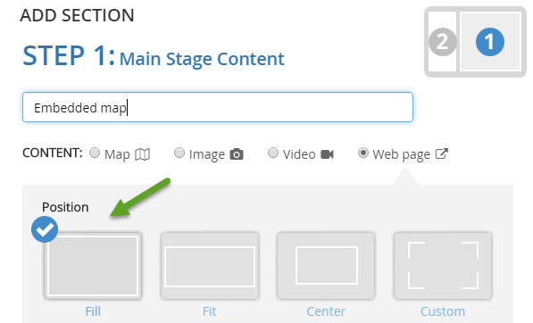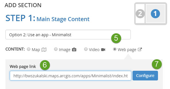 Step 5. In the Map Journal builder, add a new section. In the main stage content, choose Web page, instead of Map.