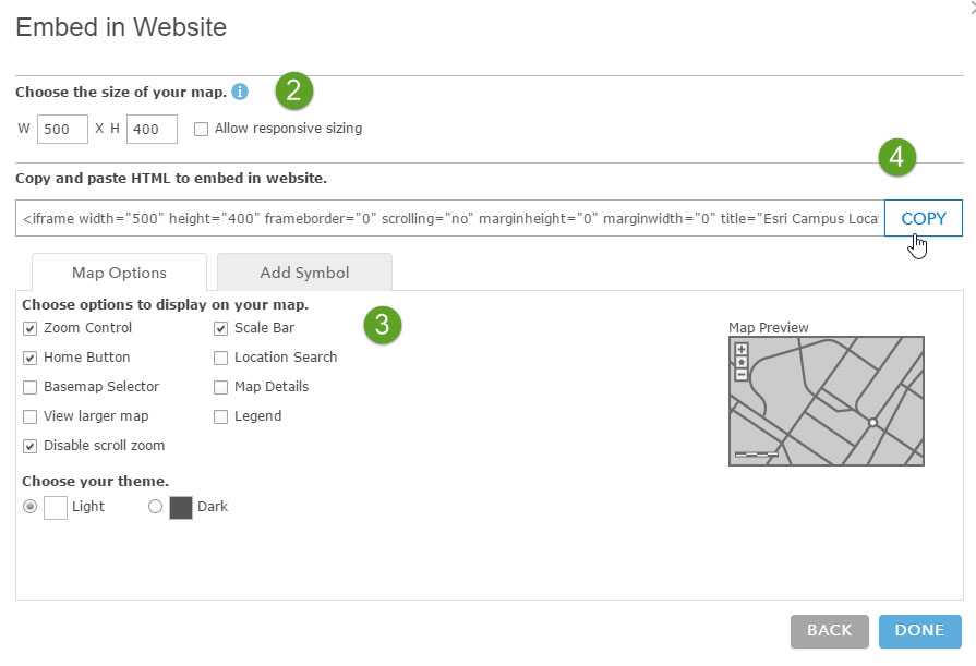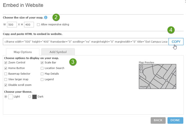Map embed code is typically used to embed a map in a website, but it can also be used to add a map to your story map with configured options, including a scale bar. Follow these steps.
