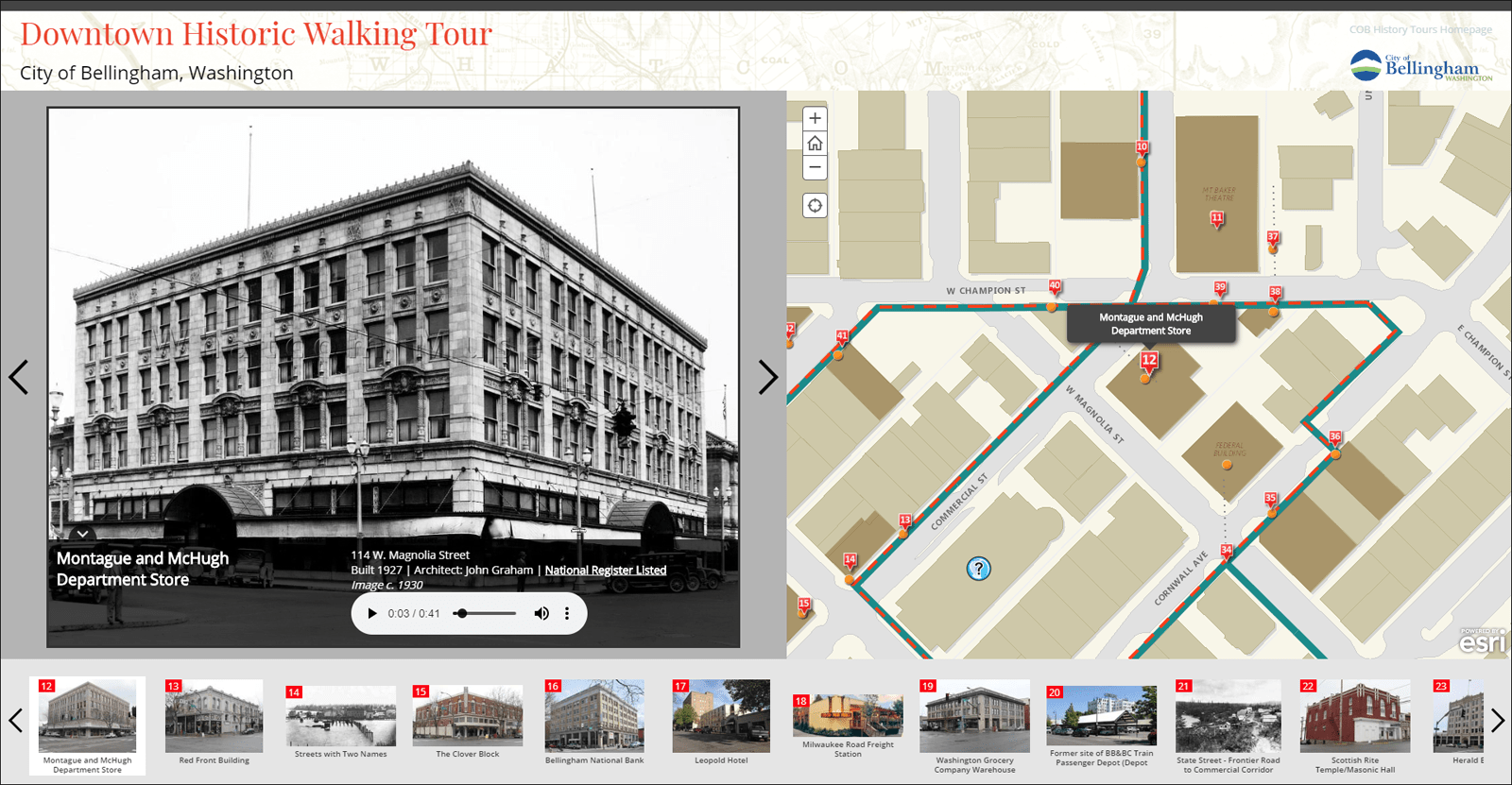 This example from the City of Bellingham, Washington—Downtown Historic Walking Tour—uses audio to enrich the story with additional information about the buildings and other features along a walking route.