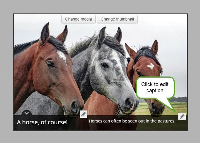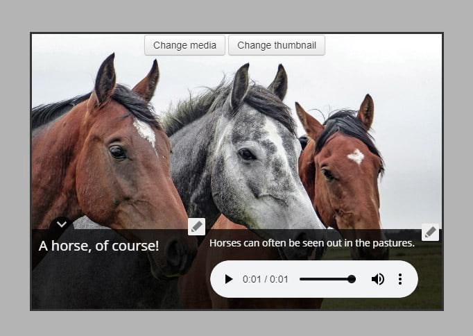 A good place to add an audio control is to the tour stop caption so it appears below the text as seen in the example tours above. Advance to the desired tour stop, and click to edit the picture caption. Depending on which layout you have chosen, the caption editing panel may appear slightly different, but adding audio works the same way no matter which layout you have chosen.