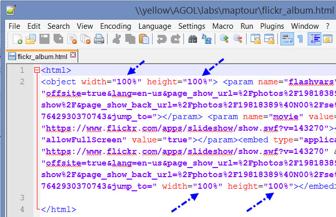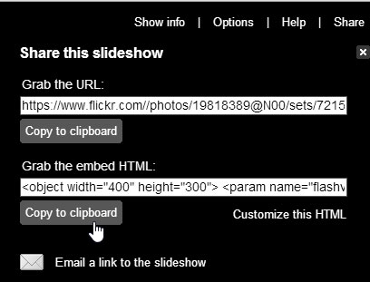 Flickr prevents you from directly embedding the slideshow. To get around this, create a simple web page by pasting the embed HTML from above between opening and closing HTML tags (<html> and </html>), and save it as a .html file. You can center and fill the slideshow by changing the width and height attributes, as indicated below: