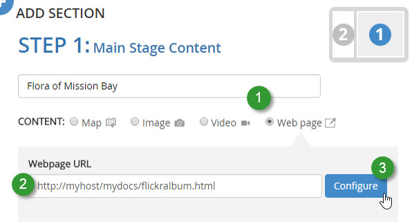 Your HTML document can be added to any Story Map that accepts a web page. Follow the instructions below to insert the Flickr album into the story map app you’ve chosen.