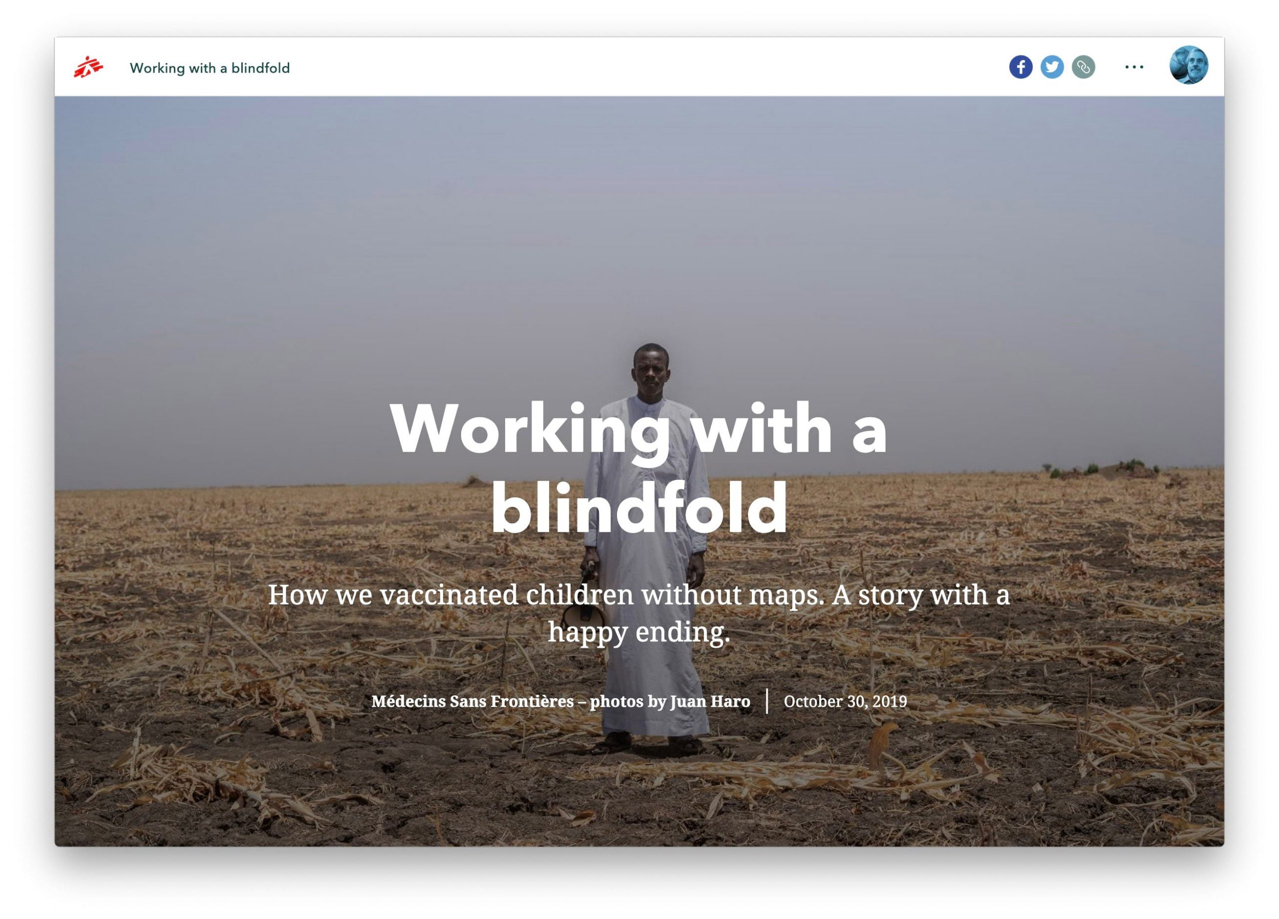 Médecins Sans Frontières’ (MSF) story map describes a measles outbreak in rural Chad. Field workers were hindered by the lack of maps of the many villages in the region. “Carrying out an operation like this without a map is like working blindfolded,” the story explains. Fortunately, MSF, the British and American Red Cross, and the Humanitarian OpenStreetMap Team had established a “Missing Maps” initiative in 2014; Missing Maps volunteers were able to use satellite imagery to compile a detailed map of the region, providing vital data to field teams working to vaccinate local populations.