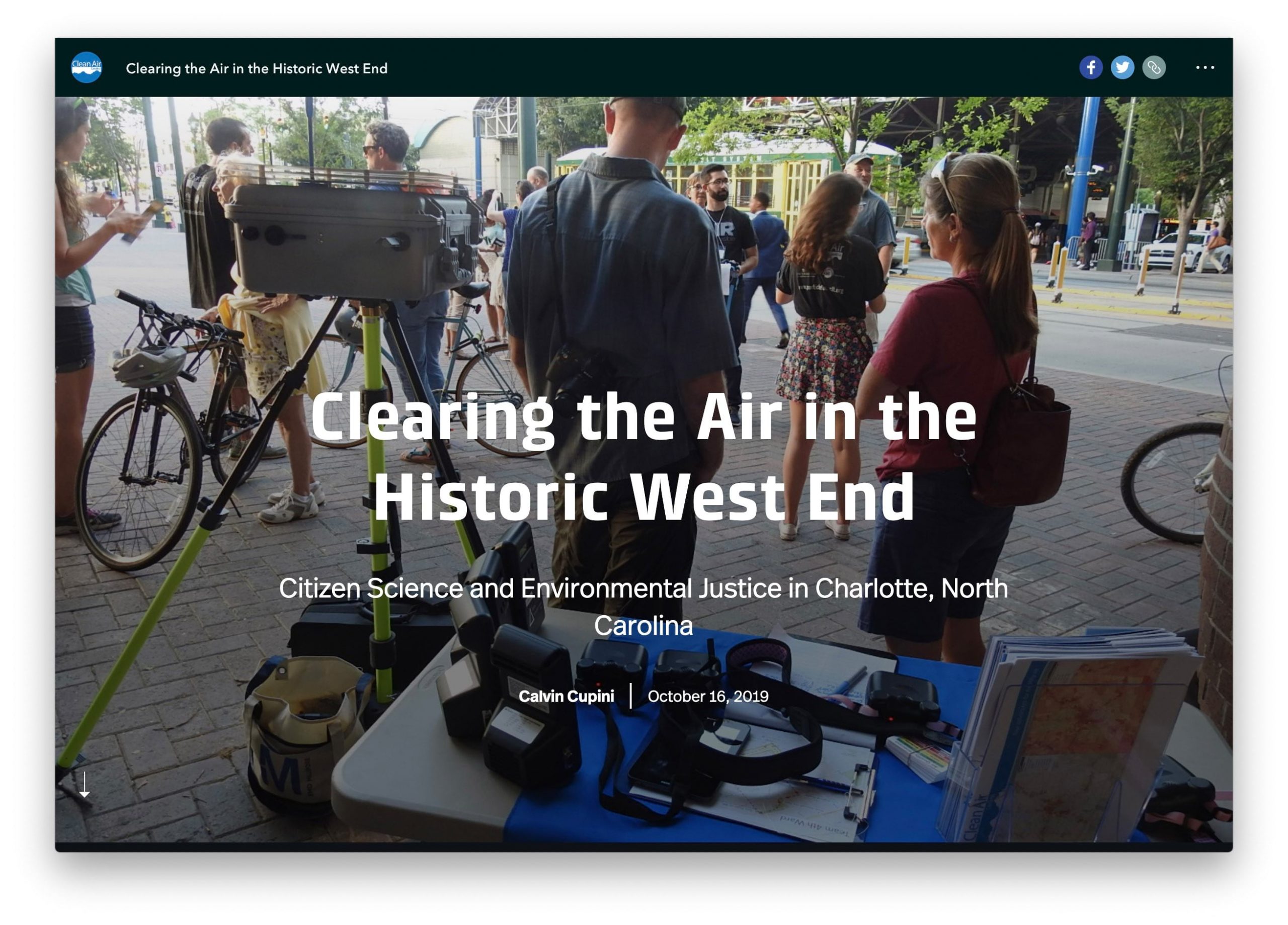 Calvin Cupini of Clean Air Carolina profiled two neighborhoods in Charlotte, North Carolina in his story map. Historic West End is primarily African American and has relatively high poverty rates, while Dilworth/Myers Park is more affluent and largely white. The story reveals patterns of past redlining, and maps the higher incidences of highway building and zoning for industry in the West End. It depicts the far greater number of air pollution sources in the West End, and makes a strong case that, in terms of environmental justice, the West End has suffered disproportionate negative effects from government policies and industry practices.