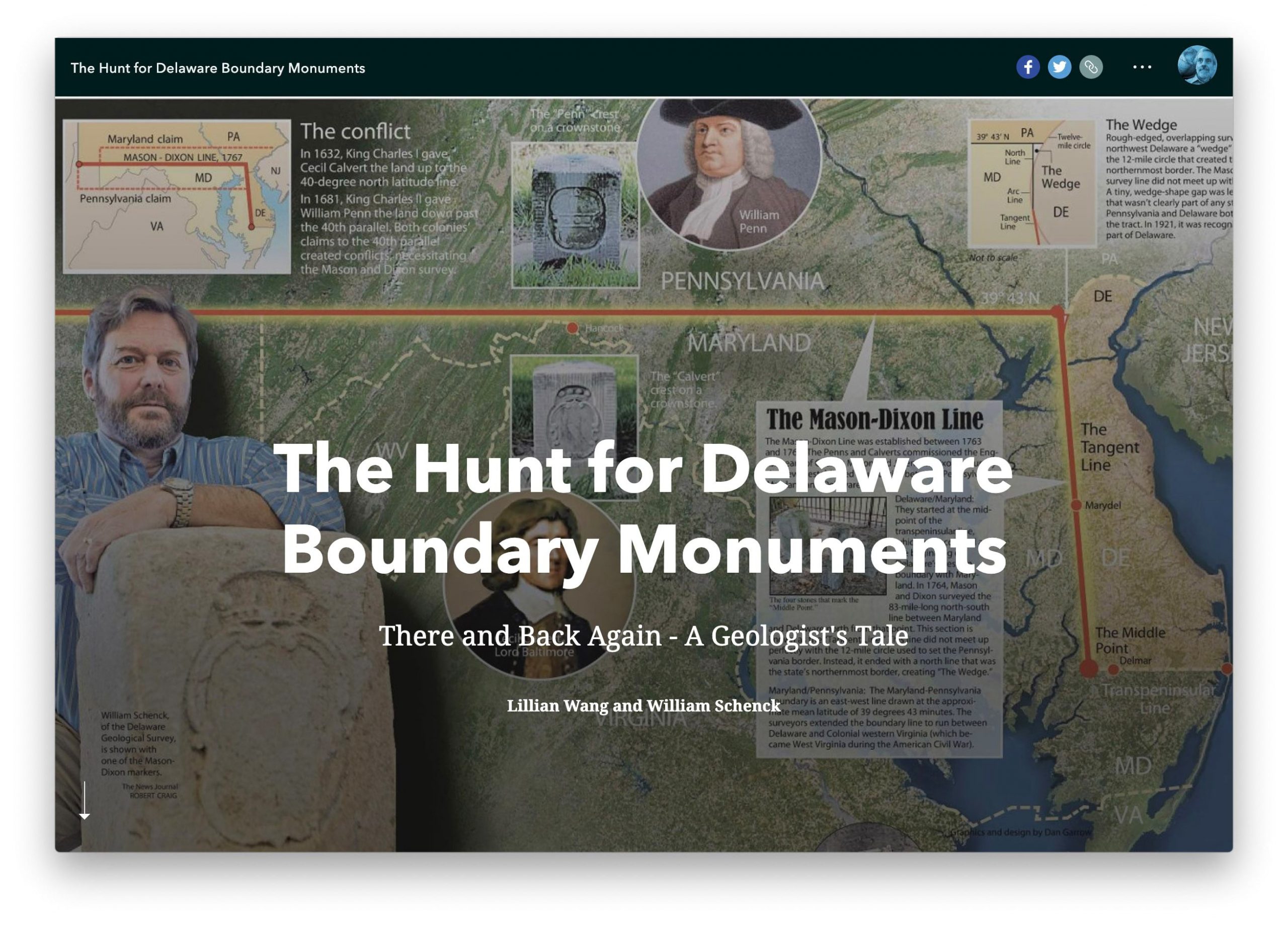 In this engaging story map, Lillian Wang and William Schenck of the Delaware Geological Survey reveal the passion Schenck applied in his efforts to locate and preserve the 179 stone monuments that define the boundary of the state of Delaware. The story describes monuments that had been moved, vandalized, or damaged by long exposure to the elements. Included, for instance, is monument 85, which was found “in the side yard of a home with a bird bath sitting on top of it. The monument was not in its original location and needed to be reset and resurveyed.” The story makes a convincing case for the historical value of Delaware’s monuments, concluding that “preserving and respecting them should be a priority for all of us.”