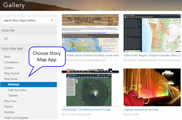 The Story Map Gallery has lots of examples that you can learn from or be inspired by, and browsing them can help you decide which template is best for you. Highlight the Story Map app on the left to filter the gallery by your choice: