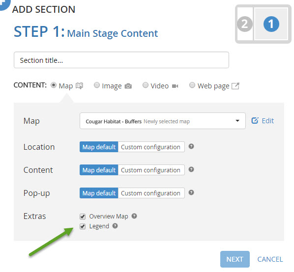 When adding a map to the Main Stage, you can choose to include a Legend or Overview Map. Click the checkboxes in the Extras section: