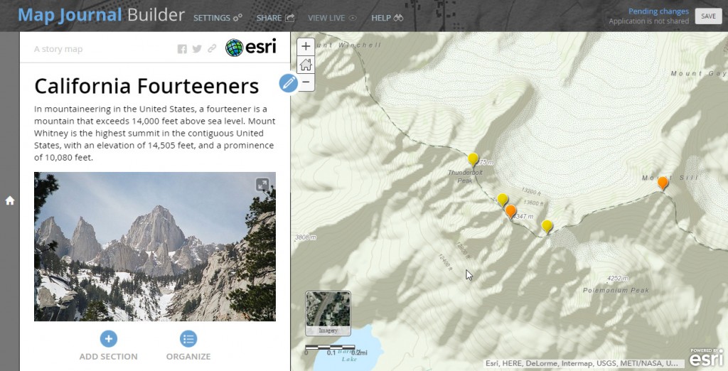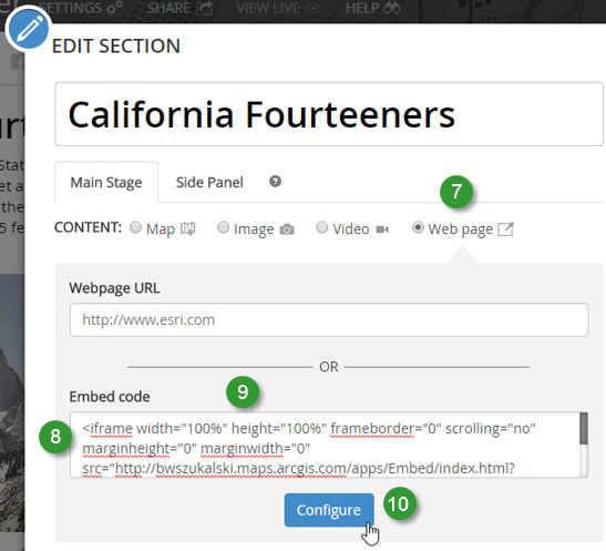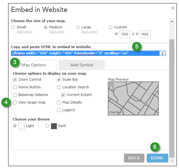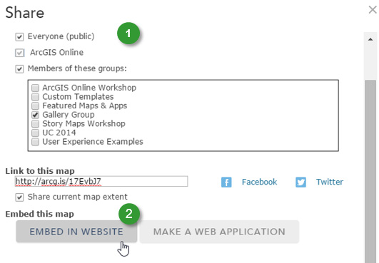 The steps for adding web map to your Map Journal were detailed in a previous blog post. Another option for adding a web map is to use the embed HTML when you share a map using Embed in Website.