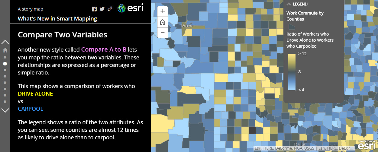 This example from What’s New in Smart Mapping uses text and color (Drive AloneĀ and Carpool) to emphasize what the map and legend show.