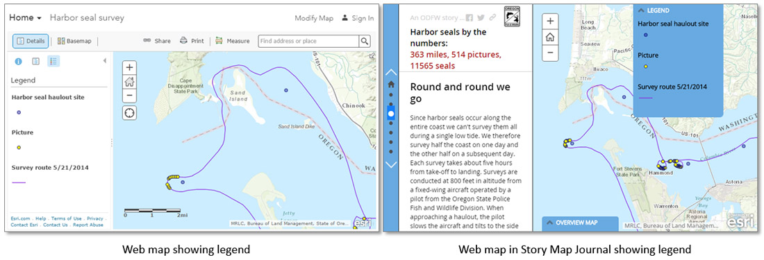 The legend is generated from the web map, and is displayed along with the map on the main stage, as shown in this example. Note the legend in the web map on the left and how it appears in the Map Journal on the right.