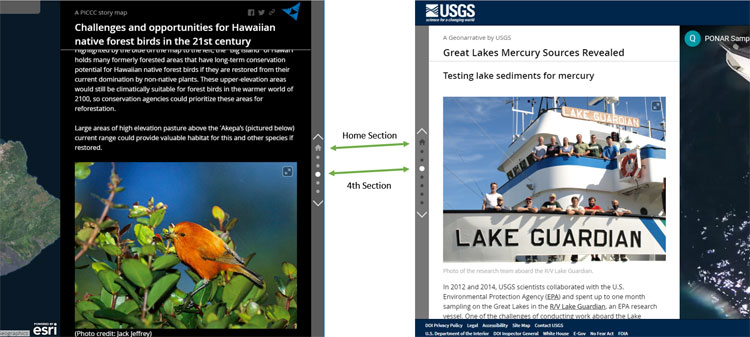 By default a Map Journal opens to the first section, also called the home section, and provides scrolling (or click) access to additional sections in the journal.