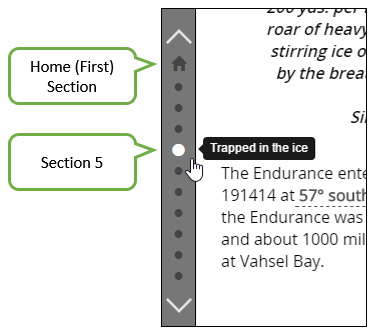 The typical Story Map Journal is composed of multiple sections. The first, or home, section is at the top, with additional sections titled and indicated by bullets. The home section is often the introduction to the story, leading the viewer on to explore subsequent sections. Scroll to move from section to section, click on bullets, or use the arrows for navigation.