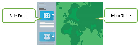 Main Stage Actions are driven from links in the side panel, and can be used to zoom the map, toggle layers, or switch from the map to other media such as videos and web pages.