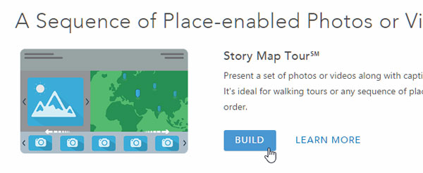 Step 1. Launch the Story Map Tour builder. There are several places to launch it, one way is to open the Apps tab at the Story Maps website, scroll to Story Map Tour, and click Build.