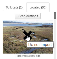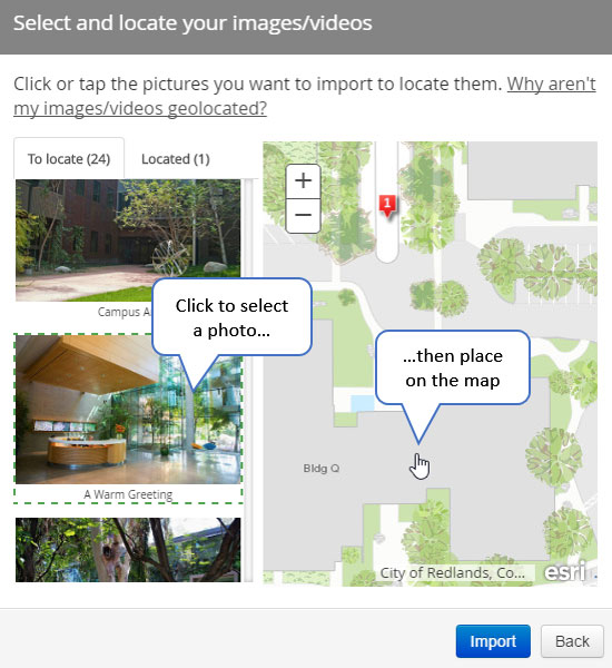 If the photos are not geotagged, they will appear in the To Locate list. Click to select a photo, then place it on the map. You can refine the locations later (Step 6).
