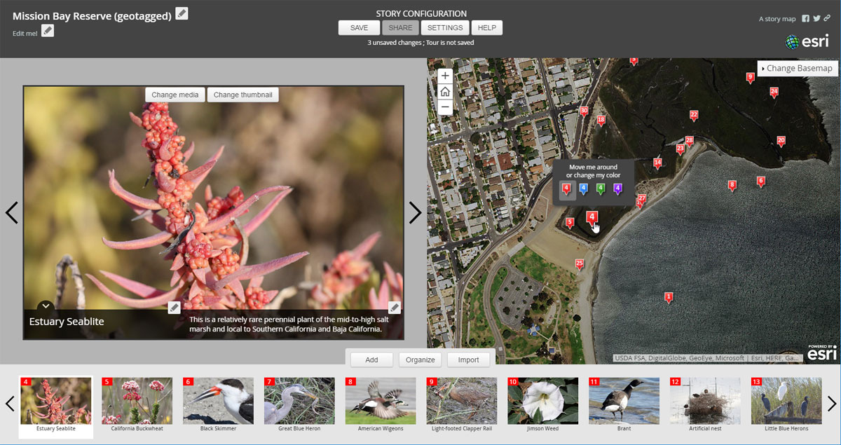 Experiment with the various options to learn more about what you can do, or view the Story Map Tour tutorial for more details. When finished, save and share your Story Map Tour.