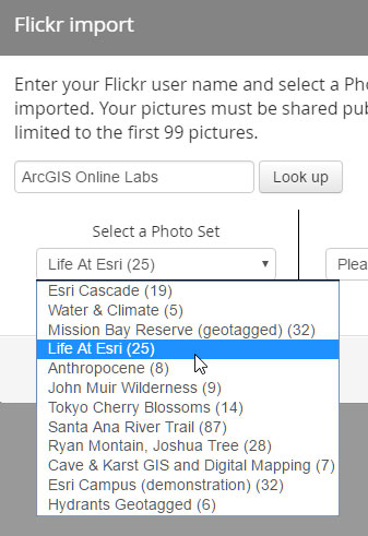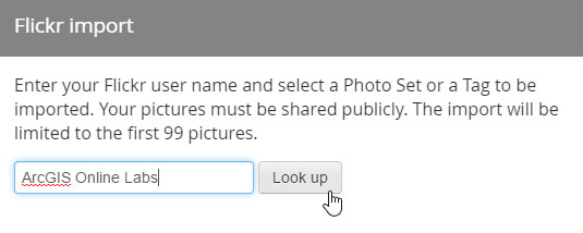 Step 3. In Flickr import, enter the Flickr user name, then click Look up. Note that your photos must be shared publicly to use in the Map Tour.