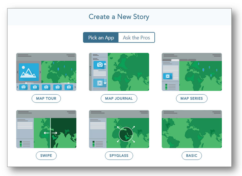 Create Story is the quickest and easiest way to author your story. Pick an App from the gallery, or Ask the Pros for a suggestion to meet your story needs. Create Story can be found in several places; on the main Story Maps home, on the Apps page, and also on My Stories. Open any of those locations and look for the Create Story button. See Using Create Story to choose a story map for more information.