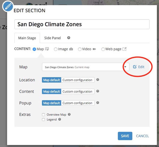 To edit a web map while building a Map Journal or Map Series, click the edit button next to the map dropdown when editing the contents of a section or entry in your story.
