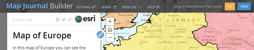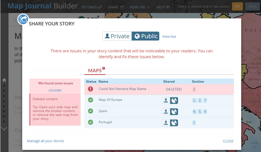 The builders for Story Map Journal and Story Map Series now automatically check your story for any issues, and enable you to troubleshoot and fix issues on the spot. For example if any content in your story is not accessible to the audience you are sharing your story with, the Story Map Journal and Story Map Series builders will notify you and enable you to share that content appropriately or replace it.