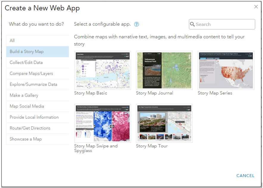 When you create a web app in ArcGIS, the updated Create a New Web App gallery includes a Build a Story Map section, displaying all Story Map application templates available using this workflow.