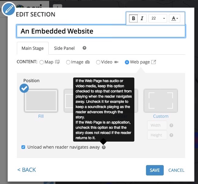 When embedding apps and web pages in Journal or Series, always use the Fill position (this is the default) so the content fills the entire main stage. Also consider disabling the option to “Unload when reader navigates away” if it makes sense for your content according the the instructions shown in the help tip.