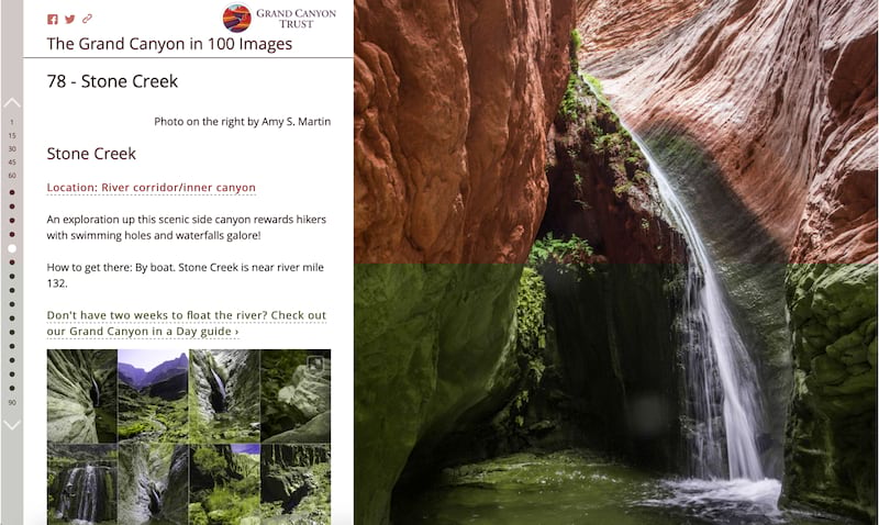 Our decision was to let the images take center stage and the map be an accompanying bonus. We wanted our readers to be emerged in the landscape much like a hike down the canyon. After testing Story Map Tour and Shortlist, Story Map Journal became the obvious choice to handle all 100 photographs, give navigation options so users can quickly jump between photos or scroll in order, allow full text and map functionality, and custom URL perimeters to move between sections. It also allowed us to embed additional images for some locations that our generous members helped supply.