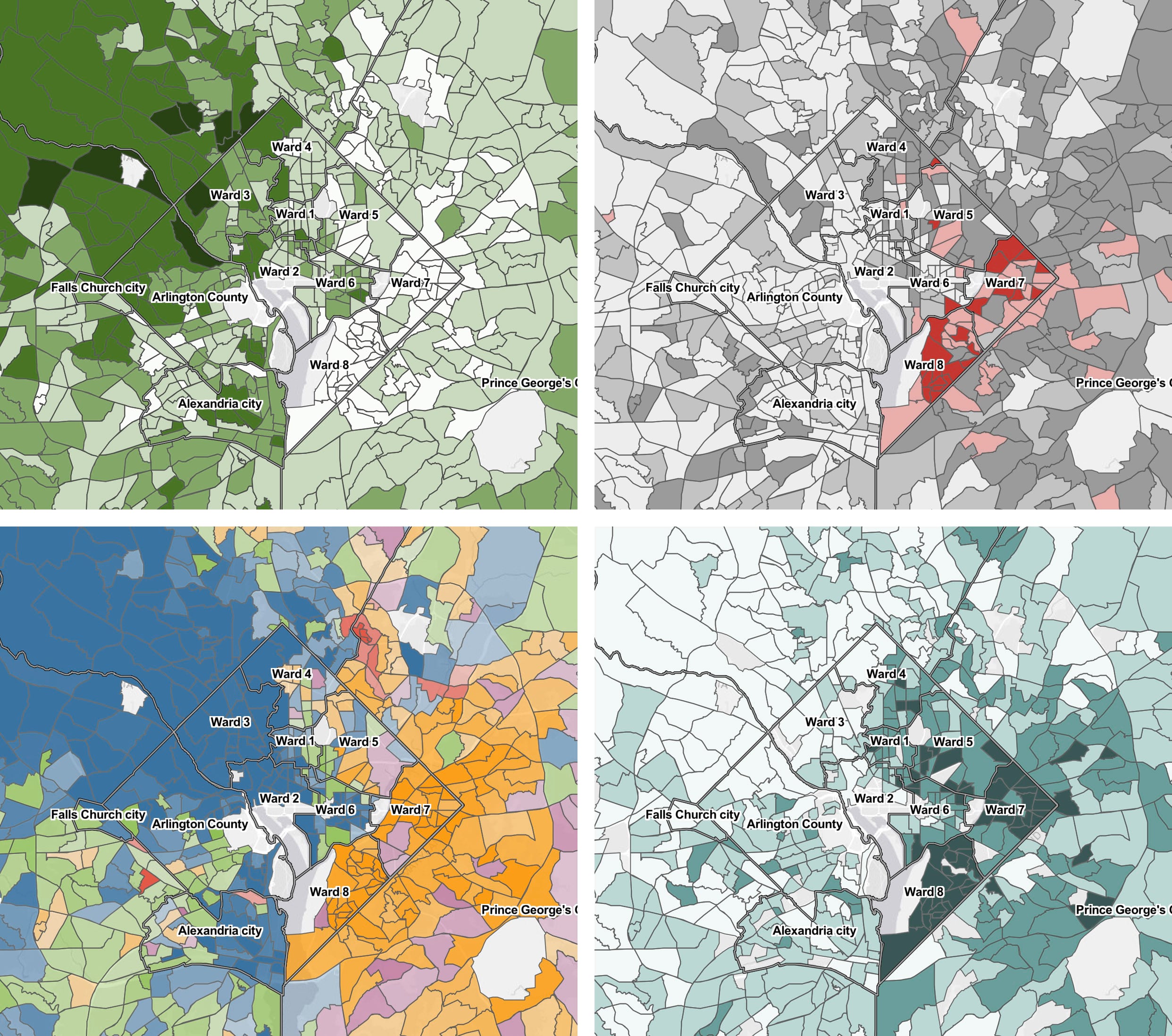 Hunger Report 2020 by the Capital Area Food Bank contains a powerful floating-panel sidecar within which four thematic maps starkly portray the DC area’s east-west socioeconomic divide. The maps’ consistent scale facilitates easy comparison across the themes; map legends and sources are included in the panels. No additional bells and whistles needed: the four maps speak for themselves.