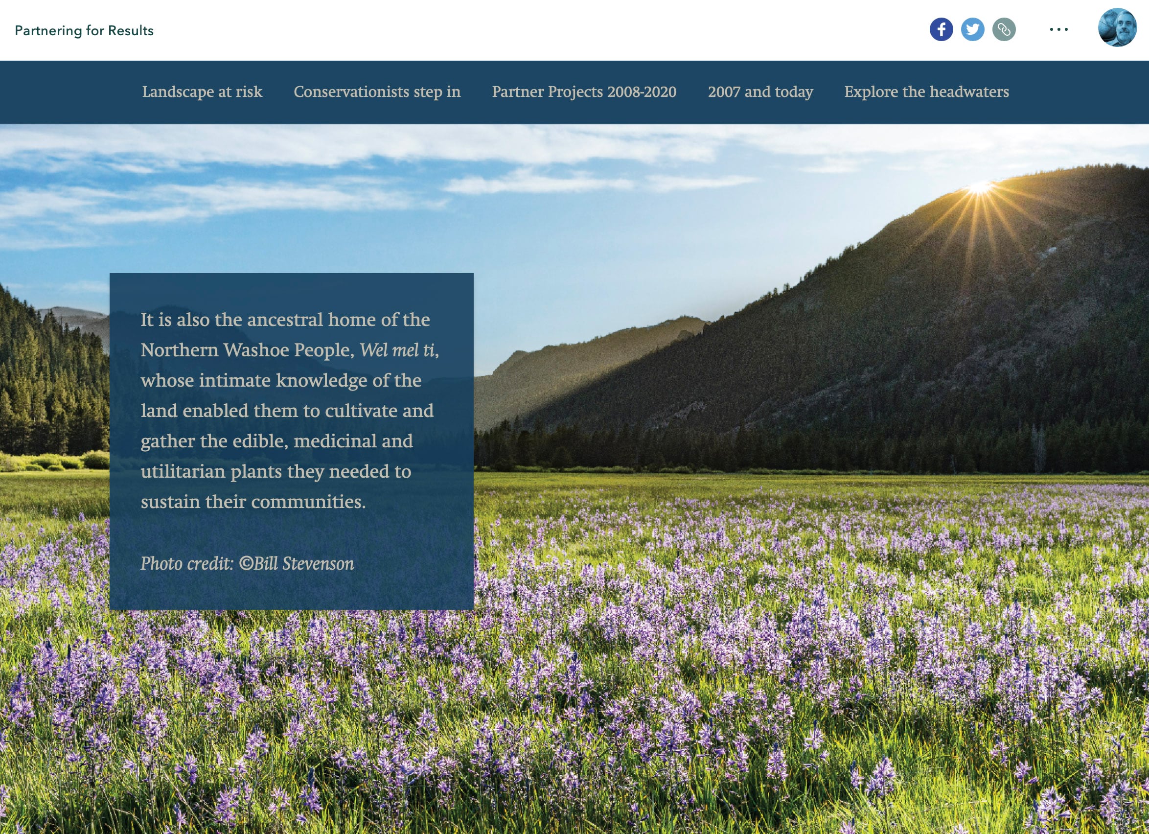 Partnering for Results by the Northern Sierra Partnership makes particularly effective use of the floating panel option. The story showcases striking photographs, videos, and static maps. Floating panels are placed to minimize interference with the images as readers scroll. Text within the sidecar sections is short (for longer text it’s usually advisable to use the docked panel layout). Use of the Tidal theme, with its dark blue background, visually unifies the floating panels with the rest of the story.