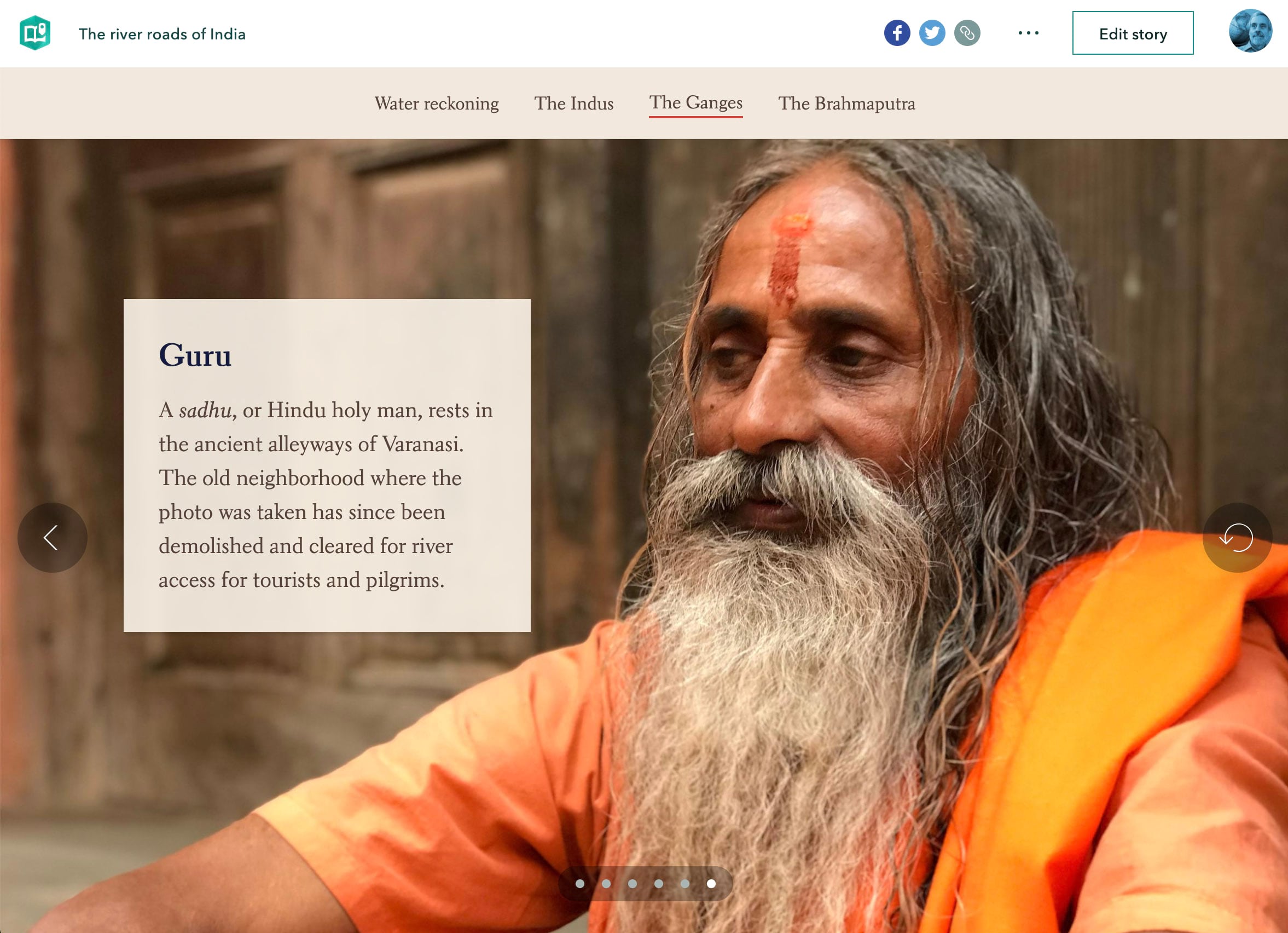 The river roads of India, on which our team collaborated with Paul Salopek’s Out of Eden Walk, uses slideshows to introduce sections featuring three of India’s major river systems. The slideshows provide a strong sense of place. They punctuate the story and add rhythm to it, and they put a human face on the story. I envision the slideshows as horizontal slices across cultures and landscapes, placed within a vertical narrative that focuses on larger issues, namely the looming water crisis facing India’s one-billion-plus people.