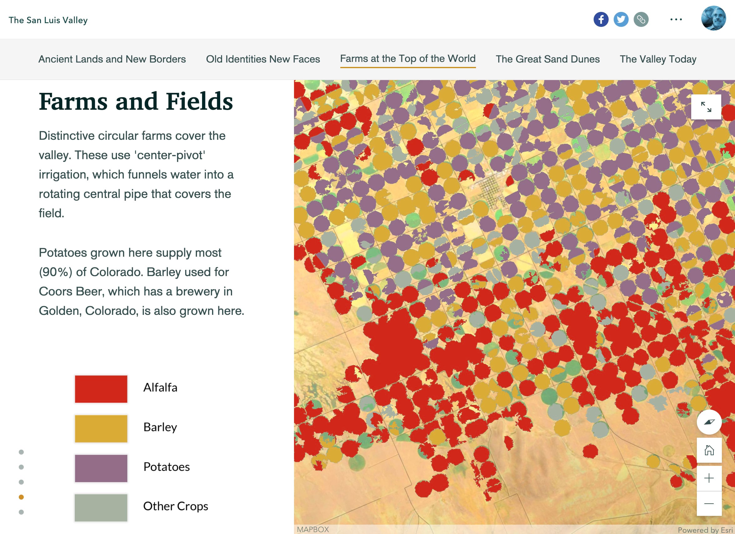 The San Luis Valley, a “personal project” by Carl Churchill, includes a docked-panel immersive within its Farms at the Top of the World section. It takes us on a virtual tour of the upper Rio Grande, even rotating the map for optimal viewing of key locations and themes. The author has also included map legends as static images within the side panel. The sidecar section is brief, but Churchill resumes the virtual tour in the next chapter of his story.