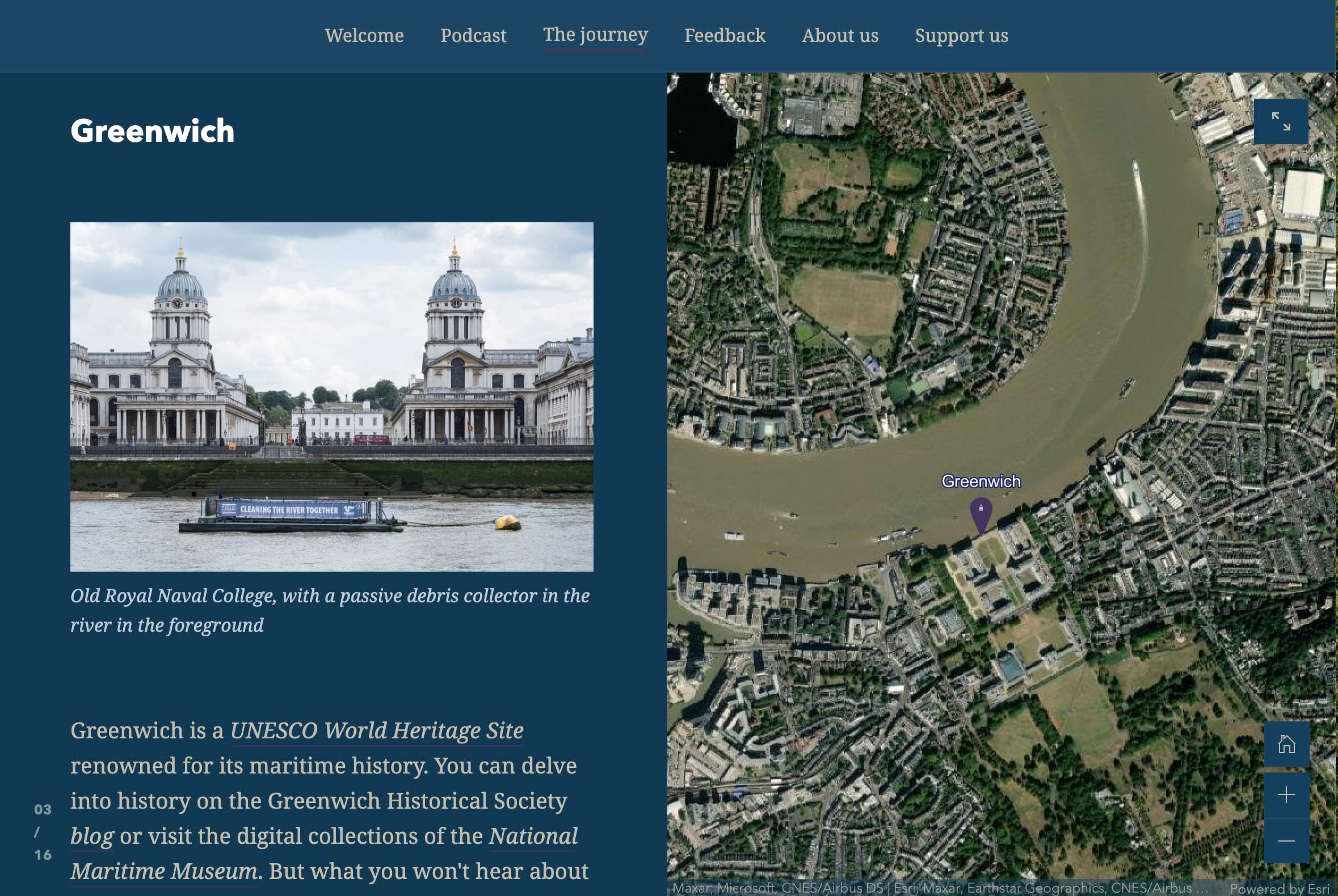 It’s good to remember that the guided tour immersive block isn’t the only way to take people on a tour. I like to use the sidecar immersive, especially the docked panel option with the panel width maximized so it fills half the screen. The Thames Estuary Partnership’s story, The Tidal Thames, uses this technique. Their use of an imagery basemap provides a vivid sense of place, and the wide side panel effectively showcases photographs of each tour point.