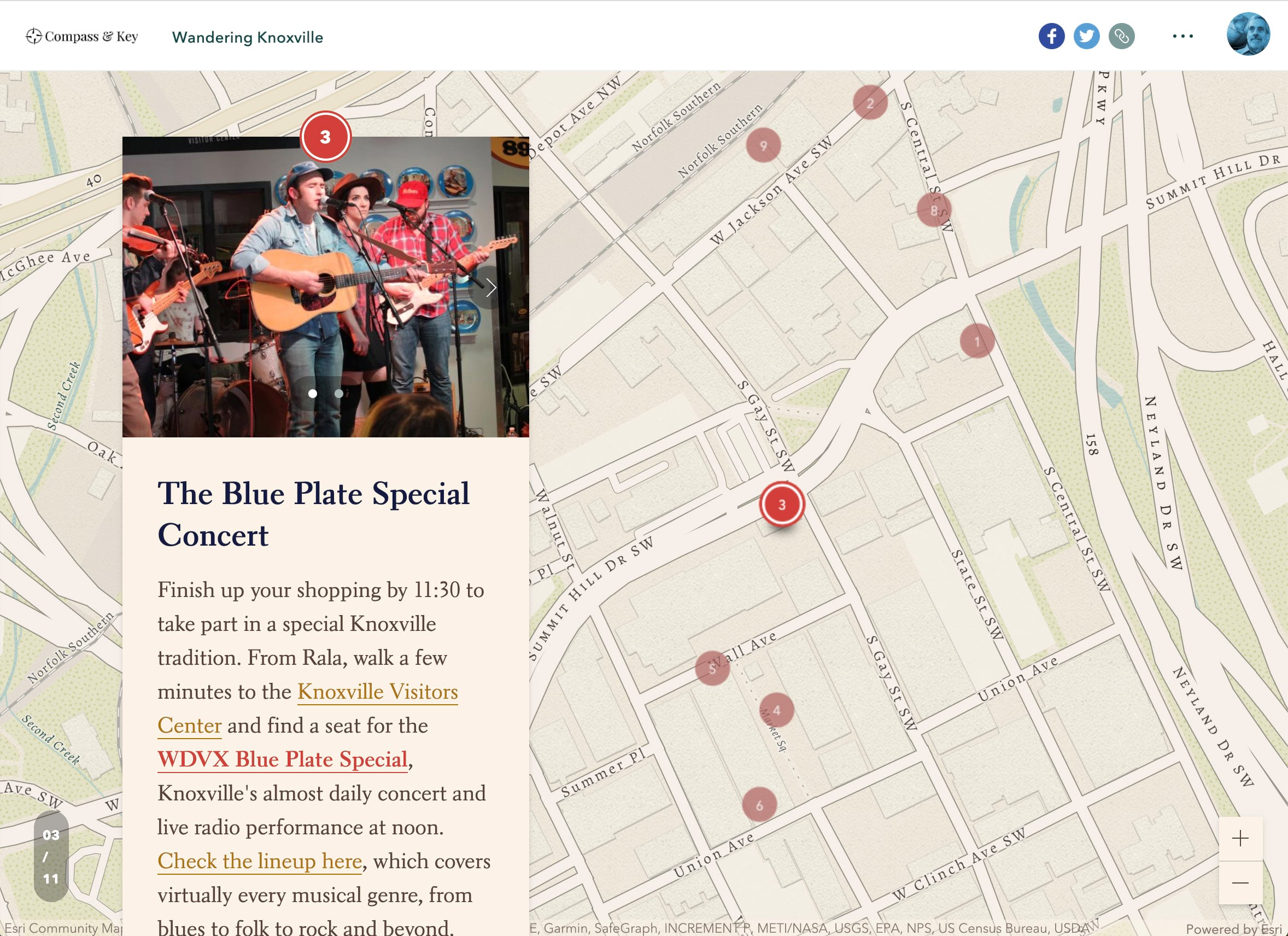 A tour worthy of emulation is Compass & Key’s Wandering Knoxville. The guided tour sets off after a brief and engaging introduction. Note how the initial map view encompasses all of the tour points. This orients the reader, while map extents for the remaining points zoom in closer. Remember that it’s easy to set custom extents for any or all of the points in your tour. Some guided tours I’ve seen remain zoomed too far out; others start so close-in that you never gain a geographic context.