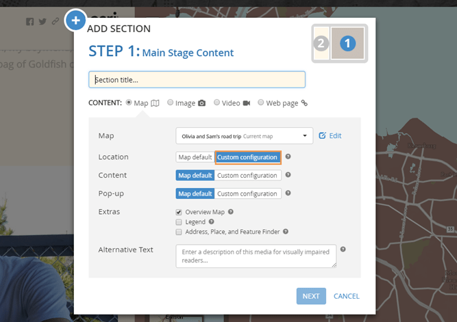 Because you’re representing a road trip, it’s important to choose a large map that encompasses your entire route, and to change the custom extent for each stop so the map slides along with the progress of your trip.