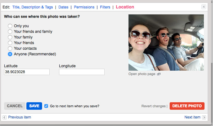 You can add location in the story map or in advance. The story map needs to know where to place each point on the map. Depending on your camera, there may already be a location associated with each photo. If not, you can input latitude and longitude in the file’s information using Flickr, Google Photos, or a desktop photo management software. I manually added the latitude and longitude values from the Google map of my trip to my photos in the Organizr in Flickr, but you can also upload your photos and choose their location manually within the story map app.