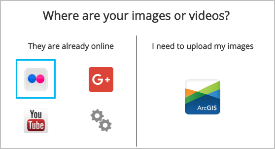 Add photos first, then videos. Once you’ve uploaded images to Flickr or Google Plus, and videos to Vimeo or Youtube, it’s time to add both to the map. When you create a new Map Tour, you’ll be prompted to select where your media is.