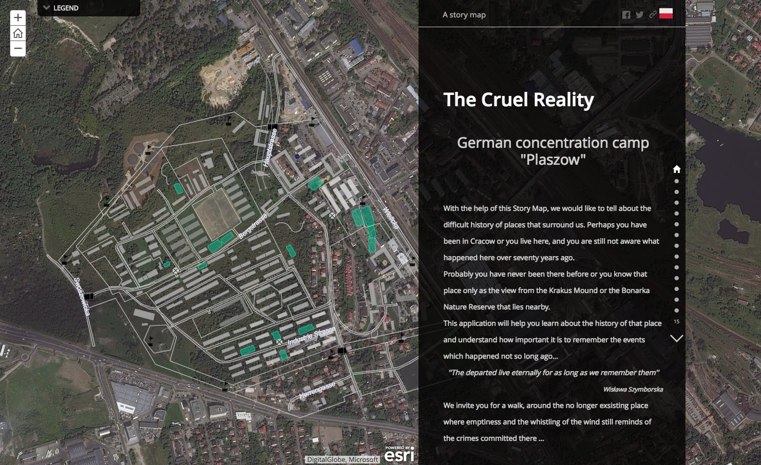 - “The Cruel Reality: German concentration camp ‘Plaszow’” maps a largely-forgotten camp in Cracow, Poland, that is now a quiet open space that belies its dark past. The Story Map plots the ghostly outlines of long-demolished camp structures and describes their use, presenting archival photographs that contrast grimly with the peaceful landscape of today.