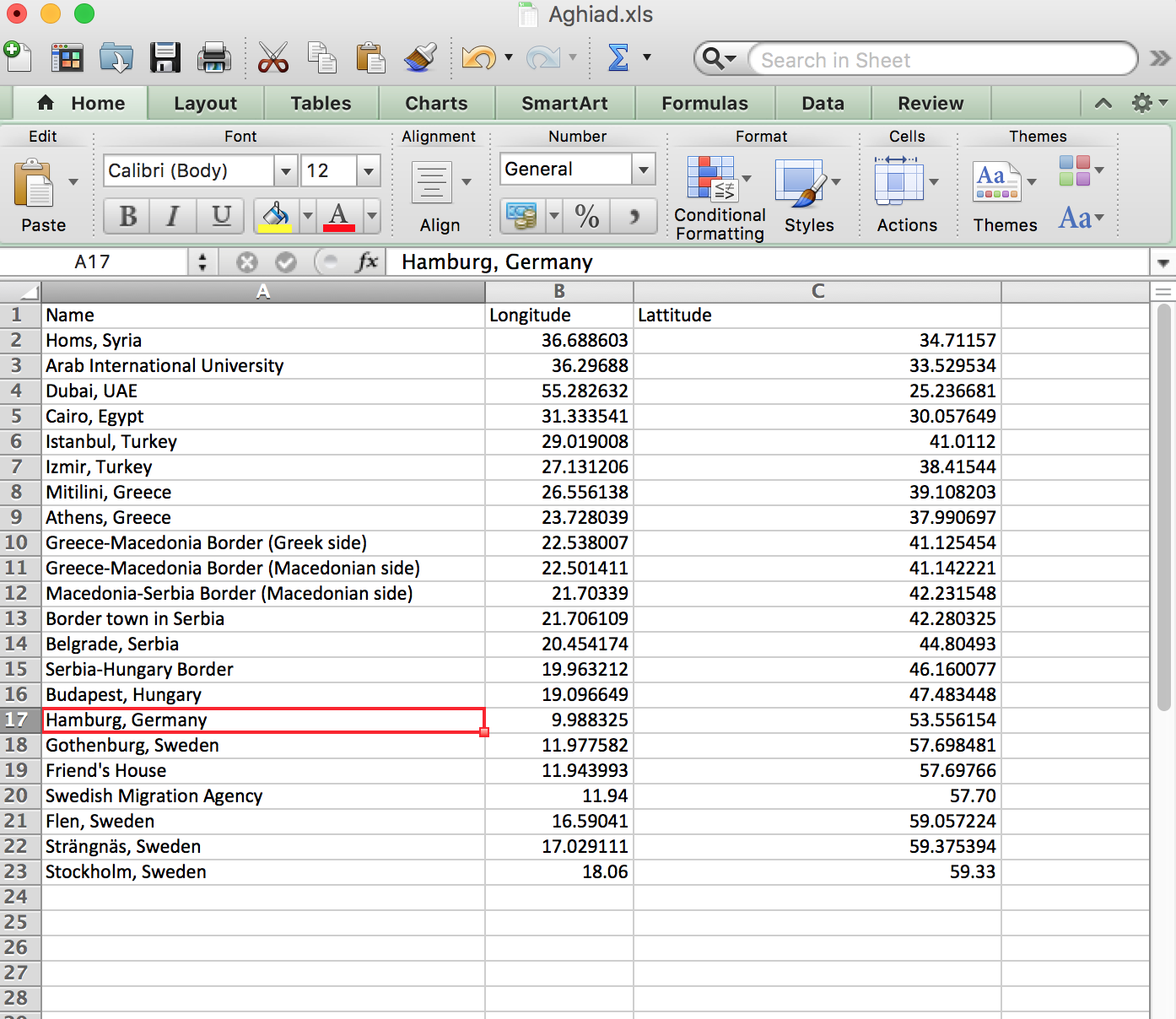 For your project, once you collect the lat/long coordinates for whatever story you are working on, make sure to separate the coordinates into two different columns in Excel, one called “Latitude” and one called “Longitude”. I included a “Name” column and added in a name for each point (e.g., “Damascus, Syria”). You can feel free to add and fill in any extra columns you see fit. Make sure that whatever you plan to include as a part of the spatial data, you add to the spreadsheet during this step. It it much more difficult to add things in later on.